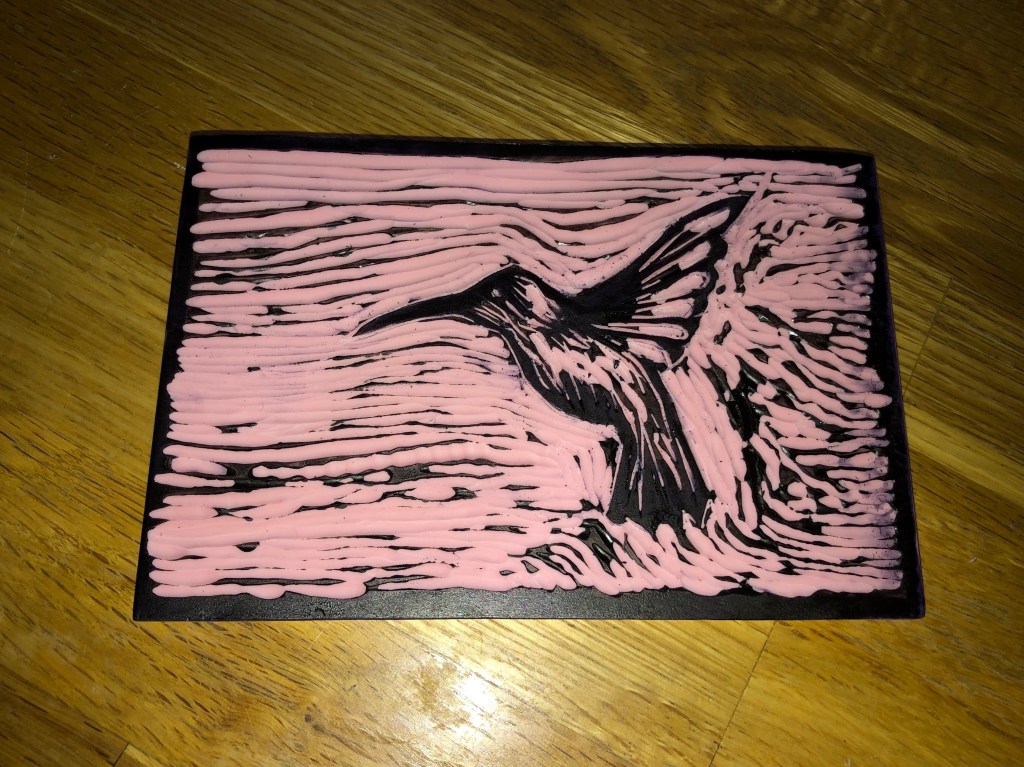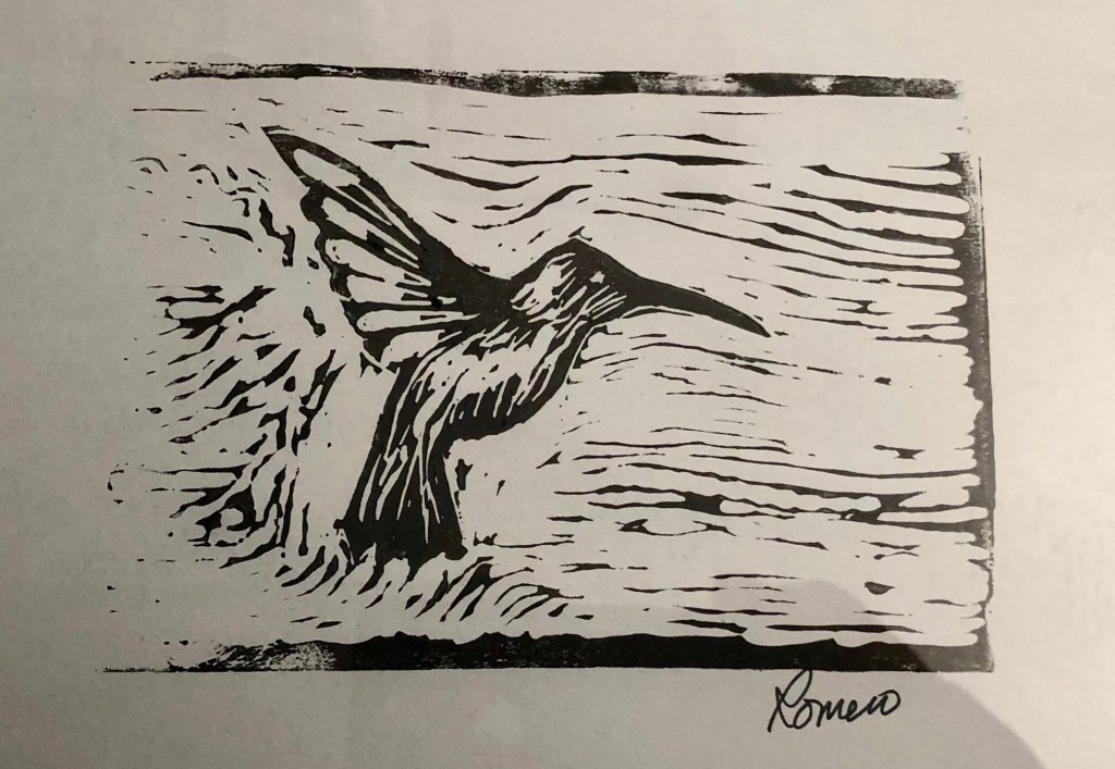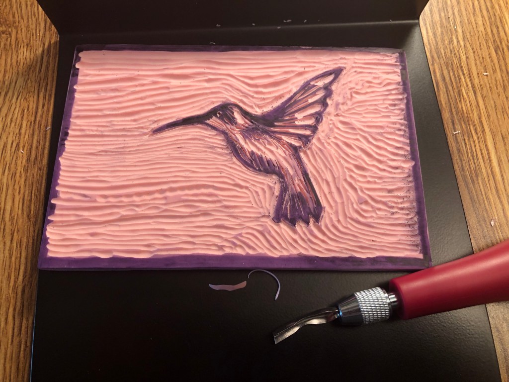 Since I’ve made quite a few digital pieces that mimicked a linocut or woodcut effect, my daughter and son-in-law gave me a printmaking kit as a gift. So here’s my attempt at making a hummingbird print with it.