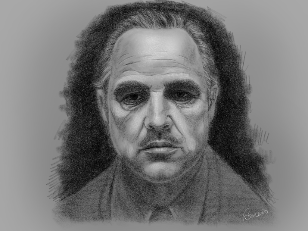 This portrait of Marlon Brando as “Don Vito Corleone” (also known as “The Godfather”), was drawn on an iPad Pro with the Pencil Brush in Adobe Fresco.